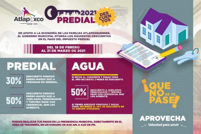 Atlapexco, Hgo.- El gobierno Municipal de Atlapexco, en apoyo a la economía a las familias de este municipio otorga descuentos de hasta el 50% para los pagos de predial y agua ,que estarán vigentes hasta el 31 de marzo del presente año.Los pagos se pueden realizar en la presidencia, directamente en el área de tesorería,… Seguir leyendo Descuentos predial 2021