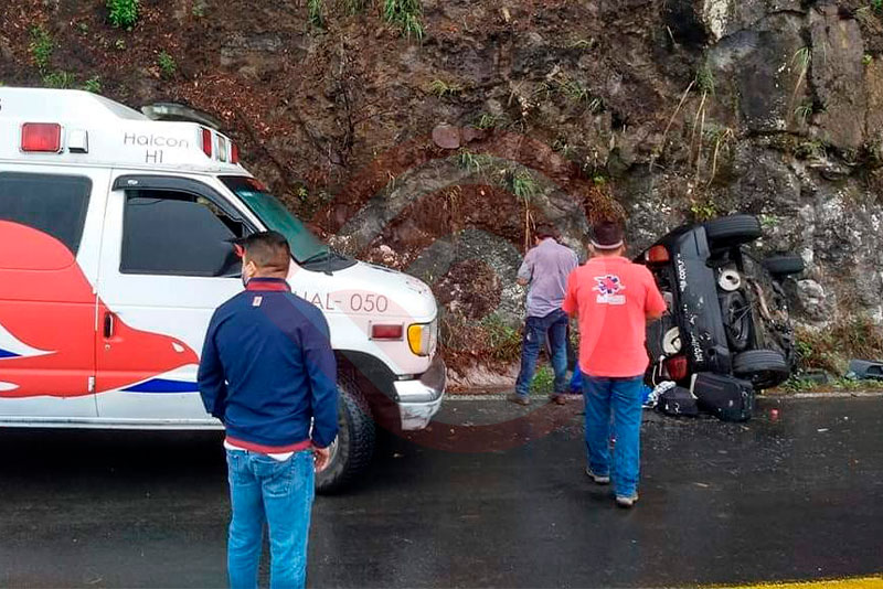 Tlanchinol, Hgo.- La mañana de este jueves sobre la carretera federal México-Tampico, entre el poblado de Quetzalzongo y el lugar conocido como Los Puentes, se registró la salida y volcadura de un vehículo particular tipo Sedán.