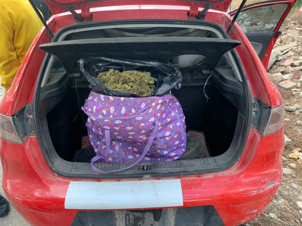 En las labores de inteligencia fue intervenido un auto Seat Ibiza, color rojo, con placas de Hidalgo, en la calle San Francisco, en el que se aseguró una maleta con importante cantidad de presunta marihuana y una báscula gramera.