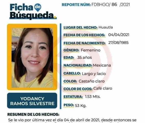 Huejutla, Hgo.- La Procuraduría General de Justicia del Estado de Hidalgo(PGJEH), a través de la comisión de búsqueda de personas, difunde la ficha de búsqueda de la maestra Yodancy Ramos Silvestre, quien se encuentra en calidad de desaparecida desde el pasado domingo.La docente de 35 años, originaria del municipio de Huautla, fue vista por última… Seguir leyendo Difunden ficha de búsqueda de maestra desaparecida