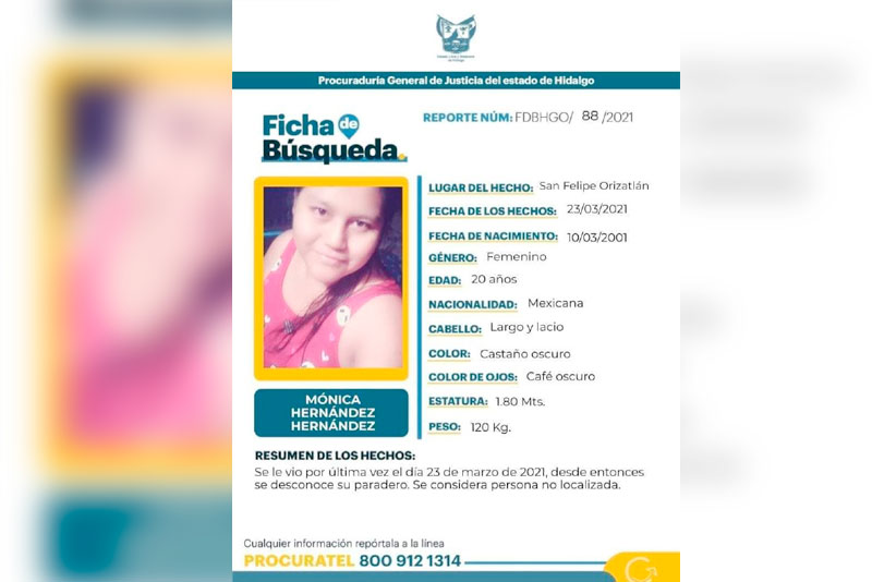 San Felipe Orizatlan, Hgo.- Jovencita que salió de su domicilio y ya no regreso, es buscada por sus familiares, ya que temen por su integridad física. La joven mujer, quien es vecina del municipio de San Felipe Orizatlan, Hidalgo, salió de su domicilio y fue vista por última vez desde el pasado 23 de marzo;… Seguir leyendo Buscan a joven desaparecida