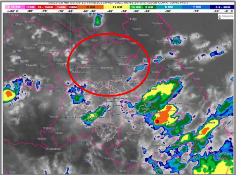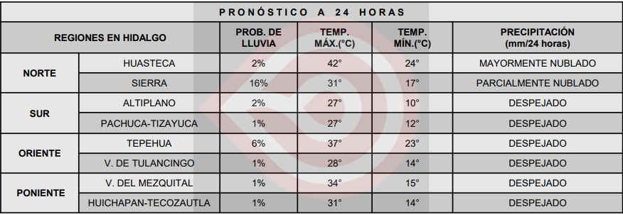 Finalmente, para las entidades de la Mesa Central se pronostica ambiente frío al amanecer en las zonas montañosas, y de caluroso a muy caluroso por la tarde; cielo despejado en la mañana y medio nublado en la tarde, con probabilidad para chubascos en Puebla, y lluvias aisladas en Hidalgo, Morelos y Tlaxcala, con descargas eléctricas y posible caída de granizo, además de viento de dirección variable de 10 a 25 km/h y rachas de 50 a 60 km/h en Guanajuato.