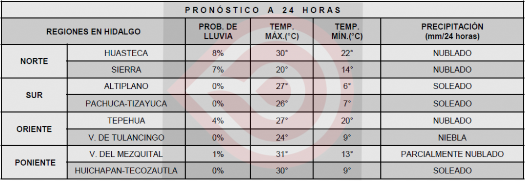 Para los estados de la Mesa Central se pronostica viento de dirección variable de 15 a 30 km/h, ambiente fresco en la mañana y de cálido a caluroso con cielo medio nublado por la tarde. Se esperan intervalos de chubascos con descargas eléctricas en Hidalgo y Puebla, lluvias aisladas con descargas eléctricas en Querétaro y rachas de viento de 50 km/h en Guanajuato.