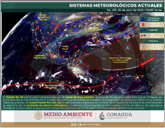 Las condiciones descritas serán originadas por el frente número 51, que se extiende como estacionario sobre el Golfo de México, en interacción con el canal de baja presión ubicado en el sureste del país, y por el Frente Frío Número 52, que ingresará en el norte de la República Mexicana durante esta tarde, en combinación con la corriente en chorro subtropical.