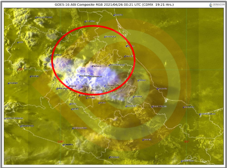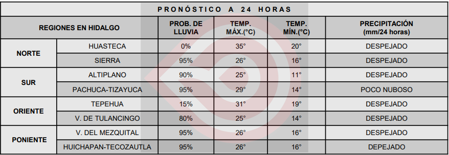 Para los estados de la Mesa Central se pronostica ambiente fresco al amanecer, y de cálido a caluroso por la tarde, así como viento de dirección variable de 10 a 25 km/h con rachas de 40 km/h. Se espera cielo parcialmente nublado durante la mañana, incremento de nubosidad hacia la tarde, con lluvias puntuales fuertes en Hidalgo y Querétaro, intervalos de chubascos en Guanajuato, Puebla y Tlaxcala, y lluvias aisladas en Morelos, todas acompañadas de posibles descargas eléctricas y caída de granizo.