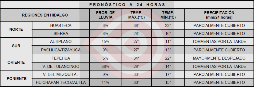 El pronóstico para la Mesa del Norte es ambiente de frío a muy frío durante la mañana en zonas serranas y viento del suroeste de 30 a 45 km/h en gran parte de la región, con rachas de 90 a 110 km/h en Chihuahua; de 80 a 90 en Durango; de 70 a 80 km/h en Coahuila y Nuevo León, y de 60 a 70 km/h en Zacatecas, todas acompañadas de tolvaneras, así como ráfagas de 50 a 60 km/h en Aguascalientes y San Luis Potosí. Se prevé cielo de medio nublado a nublado, con intervalos de chubascos, descargas eléctricas y posible caída de granizo en Coahuila y Nuevo León, y lluvias aisladas en Chihuahua, Durango y San Luis Potosí. Además, se estima la posible formación de torbellinos o tornados en el norte de Coahuila.