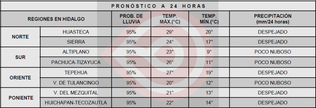 Finalmente, para las entidades de la Mesa Central se pronostica ambiente fresco al amanecer con cielo medio nublado en la mañana, mientras que por la tarde el ambiente será nublado y caluroso. Se prevén lluvias puntuales muy fuertes en Hidalgo y Puebla, y fuertes en Tlaxcala, las cuales estarán acompañadas de descargas eléctricas y posible caída de granizo, además de chubascos en zonas de Guanajuato, Morelos y Querétaro, así como viento de dirección variable de 10 a 25 km/h en la región, con rachas de 50 a 60 km/h en Guanajuato.