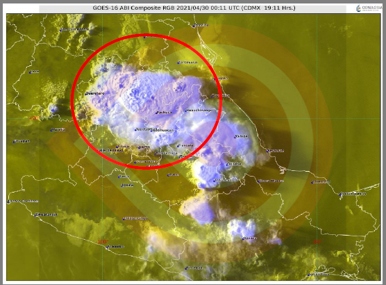 Asimismo, se estima la posibilidad de caída de granizo en localidades de Chihuahua, Ciudad de México, Coahuila, Durango, Estado de México, Hidalgo, Nuevo León, Puebla, San Luis Potosí, Tlaxcala y Zacatecas, así como el desarrollo de tormentas eléctricas en dichas entidades, además de Campeche, Chiapas, Guanajuato, Guerrero, Michoacán, Oaxaca, Querétaro, Tabasco, Tamaulipas y Veracruz.