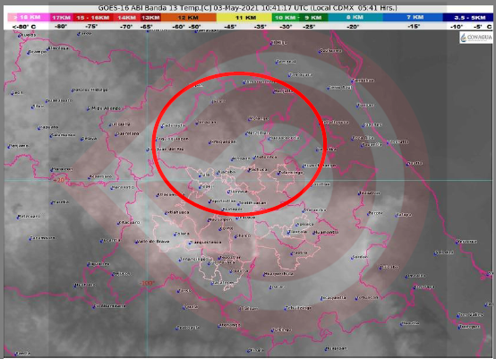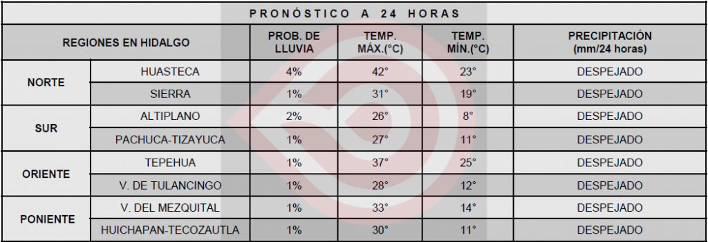Para los estados de la Mesa Central se pronostica ambiente fresco al amanecer y de caluroso a muy caluroso durante la tarde, así como viento del suroeste de 10 a 25 km/h, con rachas de 40 a 50 km/h en zonas de chubascos. Se prevé cielo medio nublado hacia la tarde, con intervalos de chubascos, descargas eléctricas y posible caída de granizo en Puebla.