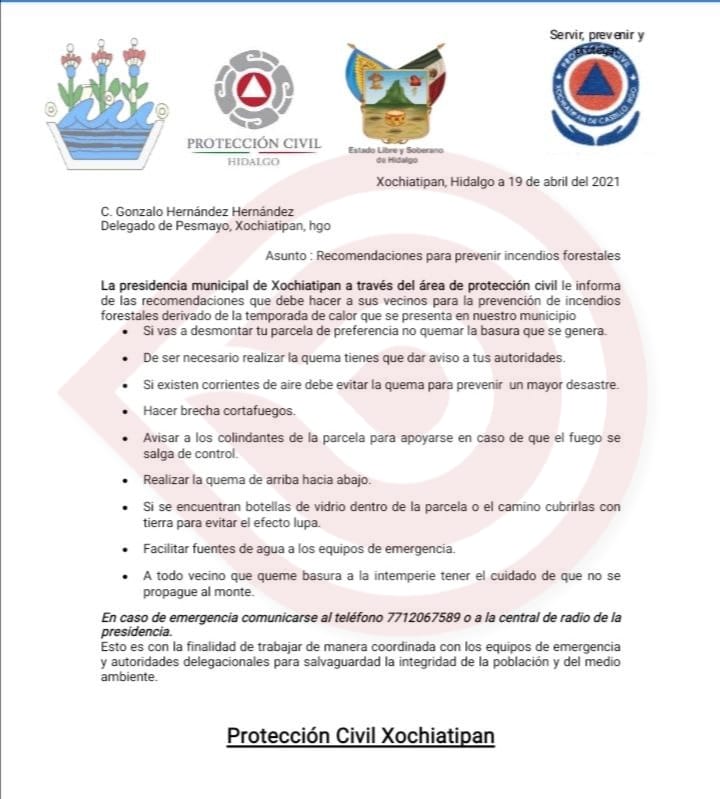 Xochiatipan, Hgo. – Efraín Cazares, titular del área de Protección Civil (PC), municipal, giro indicaciones por escrito a los delegados de las comunidades y barrios para evitar que durante la presente temporada de calor se realicen quemas agrícolas o de basura, ya que podría ponerse en grave riesgo la integridad física de las personas o sus patrimonios.