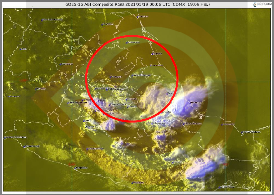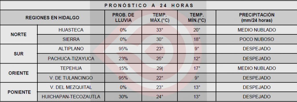 Finalmente, para los estados de la Mesa Central se pronostica cielo medio nublado con incremento de nubosidad hacia la tarde, viento de dirección variable de 10 a 25 km/h, ambiente fresco en la mañana, con bancos de niebla en zonas serranas, y de cálido a caluroso por la tarde. Se prevén lluvias fuertes con descargas eléctricas y granizo en Hidalgo y Puebla, chubascos con descargas eléctricas en Morelos, Querétaro y Tlaxcala y lluvias aisladas en Guanajuato. Se esperan rachas de viento de 50 a 60 km/h en Guanajuato y Querétaro, y de 40 a 50 km/h en zonas con lluvia.