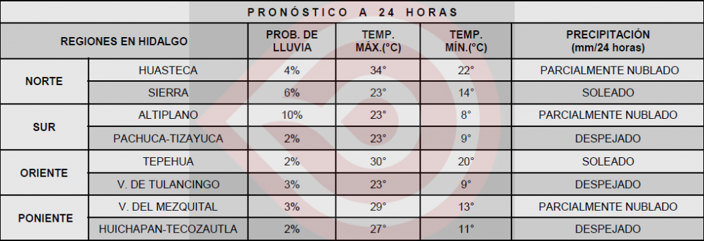 Para las entidades de la Mesa Central se pronostica ambiente fresco al amanecer con bancos de niebla en zonas montañosas, de cálido a caluroso con cielo de medio nublado a nublado por la tarde. Se prevén lluvias fuertes en Puebla, chubascos en Hidalgo, Querétaro y Tlaxcala, y lluvias aisladas en Guanajuato, todas con descargas eléctricas y posible caída de granizo en Puebla y Tlaxcala, así como viento de dirección variable 10 a 25 km/h en la región y rachas de 50 a 60 km/h en Guanajuato.