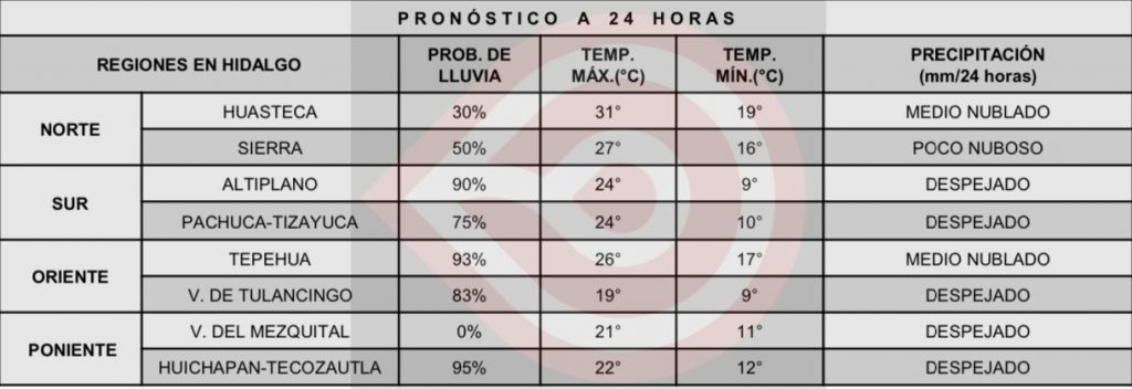 Se exhorta a la población a mantenerse informada sobre las condiciones meteorológicas mediante las páginas de internet www.gob.mx/conagua y https://smn.conagua.gob.mx, en las cuentas de Twitter @conagua_mx, @conagua_clima y @conagua_hgo, y de Facebook www.facebook.com/conaguamx, así como en la aplicación para dispositivos móviles ConaguaClima, donde se puede consultar el pronóstico por municipio.
