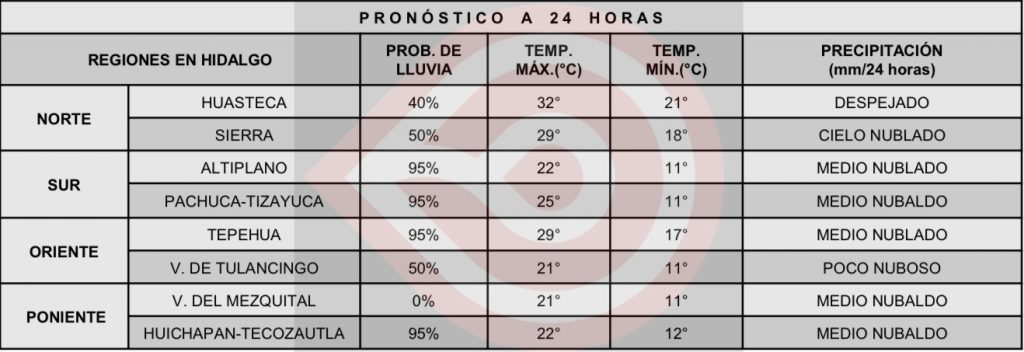 Para los estados de la Mesa Central se pronostica cielo de medio nublado a nublado por la tarde, viento de dirección variable de 10 a 25 km/h, ambiente fresco en la mañana, con bancos de niebla en zonas serranas, y de cálido a caluroso por la tarde. Se prevén intervalos de chubascos en Morelos, Puebla y Tlaxcala, lluvias aisladas en Guanajuato, Hidalgo y Querétaro, y rachas de viento de 50 a 60 km/h en Guanajuato. Las lluvias se acompañarán de descargas eléctricas, posible granizo y rachas de viento de 30 a 40 km/h.