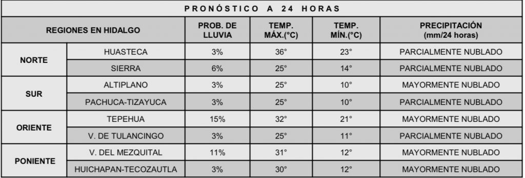 Para las entidades de la Mesa Central se pronostica ambiente fresco al amanecer, con bancos de niebla en zonas serranas, y de cálido a caluroso hacia la tarde. Se prevé cielo despejado por la mañana, nublado hacia la tarde, con chubascos, tormentas eléctricas y posible caída de granizo en Morelos, Puebla y Tlaxcala, lluvias aisladas en Hidalgo, así como viento de dirección variable de 10 a 25 km/h, con rachas de hasta 45 km/h en zonas de lluvia.