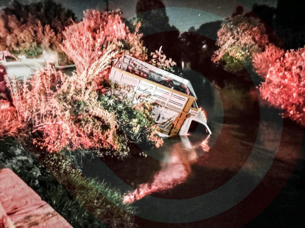 Una camioneta con caja de redilas, cargada con neumáticos y accesorios, fue asegurada tras caer durante la huida dentro de un canal de aguas negras que cruza por la zona.