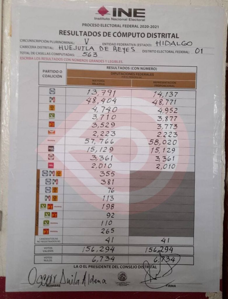 El Consejero Presidente del 01 Consejo Distrital del INE en Huejutla, Oscar Ávila Aldana; dijo que el recuento de votos se llevó a cabo en 3 grupos de trabajo; grupo 1 con 4 puntos de recuento contaron 205 paquetes; grupo 2 con 4 puntos de recuento contaron 205 paquetes y grupo 3 con 3 puntos de recuento contaron 153 paquetes electorales.