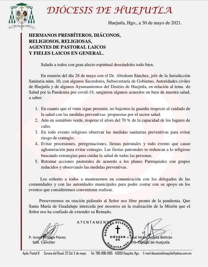 En su momento, el Obispo de la Diócesis de Huejuta, José Hiraís Acosta Beltrán; recordó que el pasado 28 de mayo se realizó una reunión con autoridades de Salud, Subsecretaría de Gobierno y Gobiernos Municipales en donde se tomaron diversos acuerdos.