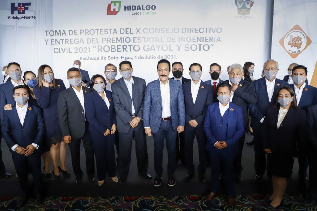Pachuca, Hgo.- “El crecimiento de Hidalgo es producto de un esfuerzo conjunto de la mano de los ingenieros aun en las condiciones más adversas de la historia”, expresó el gobernador Omar Fayad durante la toma de protesta del X Consejo Directivo del Colegio de Ingenieros Civiles y la entrega del Premio estatal de Ingeniería Civil 2021 “Roberto Gayol y Soto”.