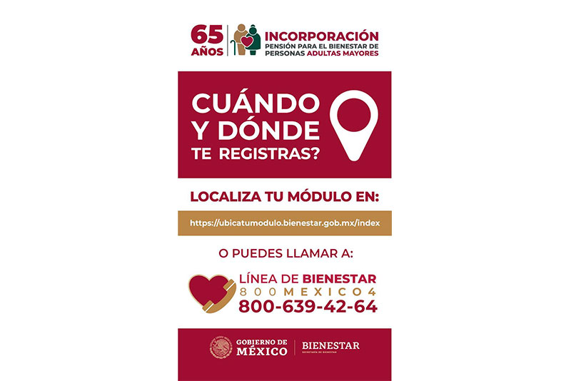 A través del portal https://ubicatumodulo.bienestar.gob.mx/index y de la Línea de Bienestar 800 MEXICO 4 (800-639-42-64), se puede localizar el módulo que le corresponde, lugar, fecha y hora; por lo que es muy importante no acudir antes de la fecha programada para brindar la mejor atención.