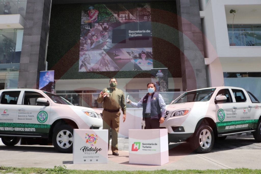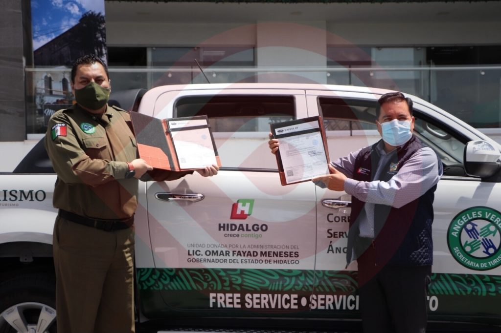 Pachuca, Hgo.- La tarde del jueves 5 de agosto se efectuó la puesta en operación de unidades vehiculares donadas por el gobernador Omar Fayad para el servicio de la Corporación de Servicios al Turista Ángeles Verdes, en representación del titular del Ejecutivo el secretario de Turismo estatal, Eduardo Javier Baños Gómez, en compañía de Alejandro Zúñiga Bernal, titular de la Corporación Ángeles Verdes.
