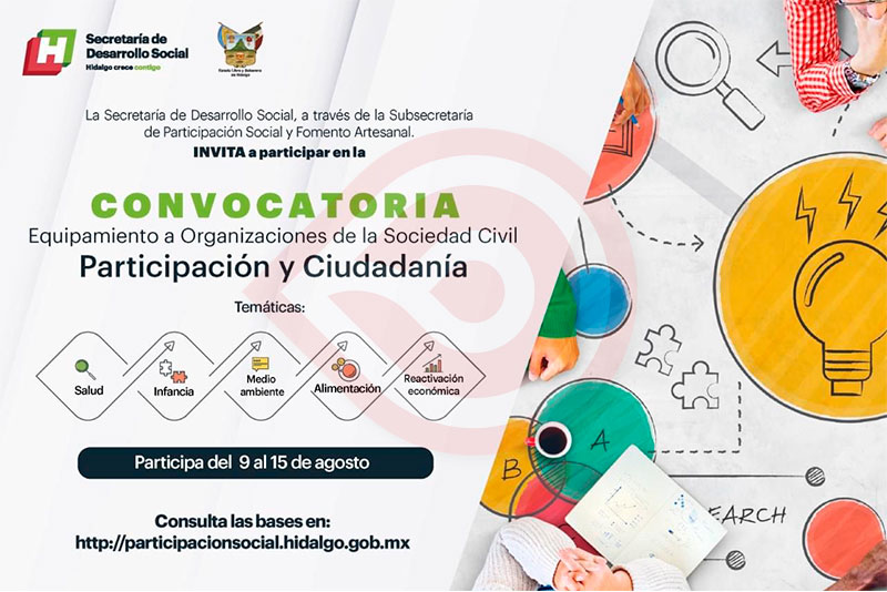 Pachuca de Soto, Hgo.- La Secretaría de Desarrollo Social (Sedeso) hace la invitación para que las Organizaciones de la Sociedad Civil (OSC’s) participen en la Convocatoria “Equipamiento a organizaciones de la sociedad civil, participación y ciudadanía” que busca potenciar el impacto de proyectos ejecutados por este sector en el estado de Hidalgo con premios que van de los 50 y hasta los 150 mil pesos.