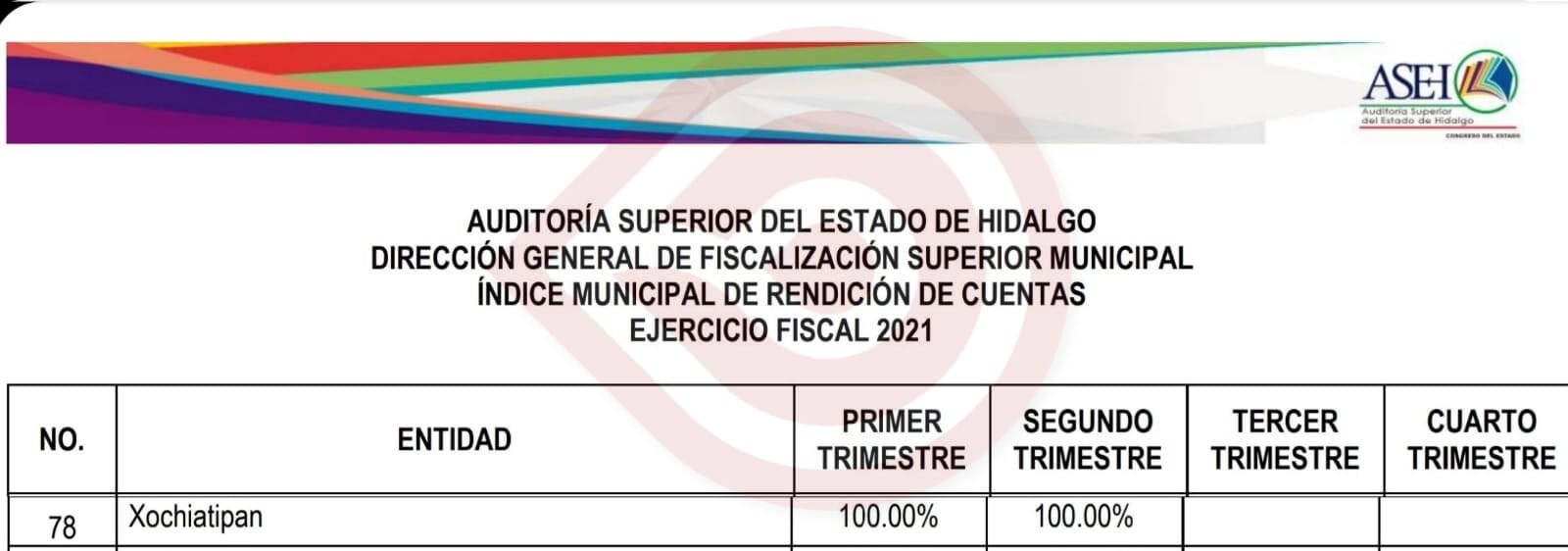 Xochiatipan, Hgo. – Como resultado del manejo transparente y responsable de recursos financieros apegados a la legalidad, el Gobierno Municipal que encabeza el alcalde Oscar Bautista, cumple al 100 por ciento con los objetivos planteados en materia de rendición de cuentas, durante el primer y segundo trimestre del ejercicio fiscal 2021, de acuerdo con información proporcionada por la ASEH (Auditoría Superior del Estado de Hidalgo).