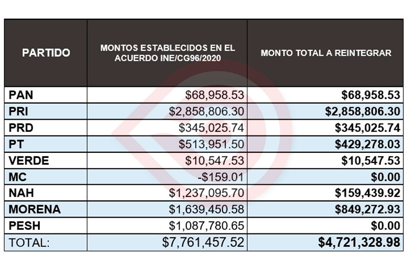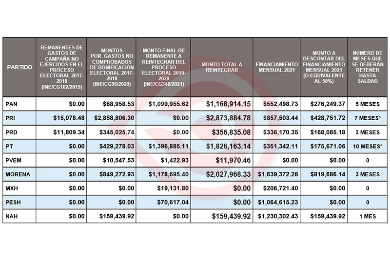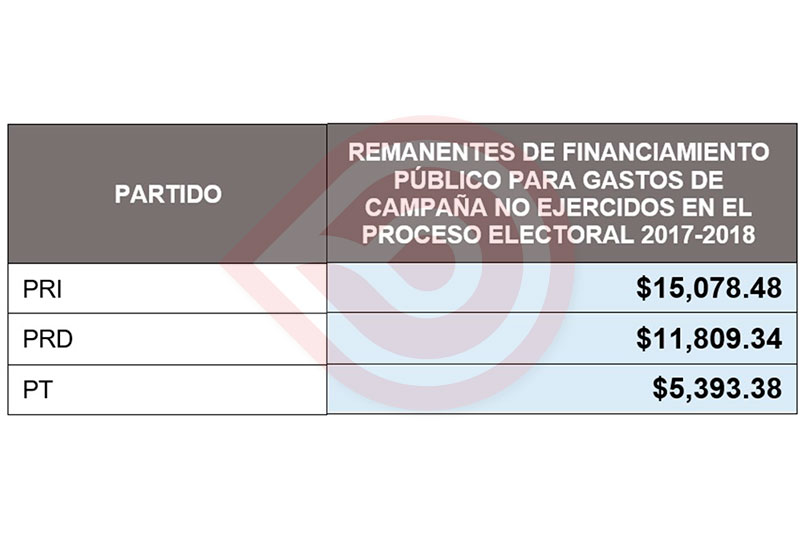 Por otro lado, fue aprobada la retención de remanentes de financiamiento público de campaña no ejercidos durante el Proceso Electoral 2017-2018, determinados en el Acuerdo INE/CG102/2019 del Consejo General del Instituto Nacional Electoral; así como la retención de los montos no comprobados por concepto de bonificación por actividad electoral del Proceso Electoral Local 2017-2018 que diversos Partidos Políticos deberán reintegrar a este Órgano Electoral, esto, en cumplimiento al Acuerdo INE/CG96/2020 del Consejo General del Instituto Nacional Electoral; así también la retención de remanentes de financiamiento público de campaña no ejercidos durante los Procesos Electorales Locales 2019-2020, aprobados mediante el Acuerdo INE/CG348/2021 del Consejo General del Instituto Nacional Electoral, quedando de la siguiente manera: