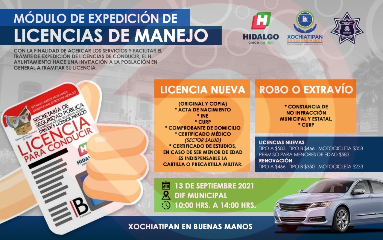 Por Redacción/Zunoticia Xochiatipan, Hgo.- Con el firme propósito de acercar y facilitar los trámites y servicios de expedición de licencias de manejo, el ayuntamiento que preside el alcalde Óscar Bautista, a través de la dirección de Seguridad Pública y Tránsito Municipal, hace una atenta invitación a la población a realizar dicho trámite que es de… Seguir leyendo 13 de septiembre, se instalará Módulo de expedición de licencias de manejo