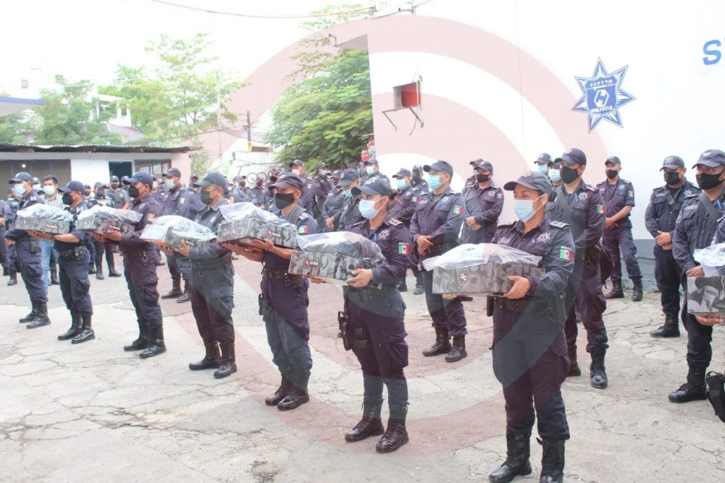 Tras el pase de lista, el alcalde huejutlense, hizo entrega de 14 radios móviles en patrullas; 22 radios portátiles; 180 uniformes y 180 botas tácticas, para mejorar las condiciones de trabajo del cuerpo policíaco.