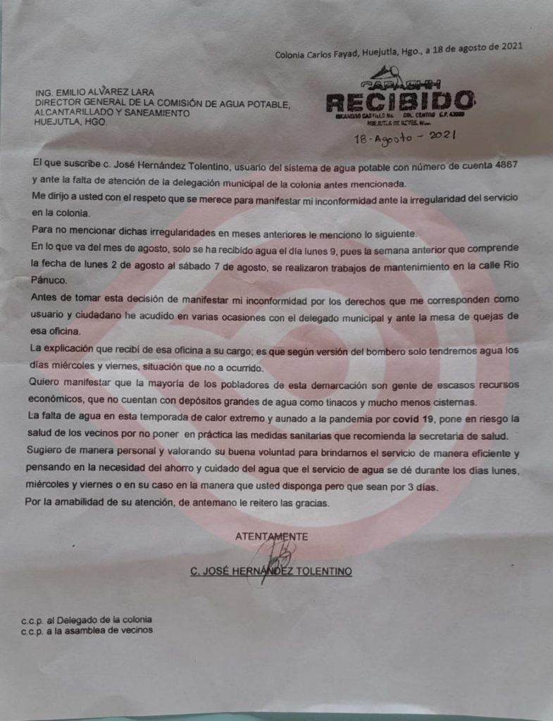 José Hernández Tolentino, vecino de la colonia Carlos Fayad, recordó que desde el pasado 18 de agosto ingresó un documento dirigido al titular de la CAPASHH, Emilio Álvarez Lara, por medio del cual piden una respuesta a esta solicitud que afecta a todos los habitantes de dicho sector.