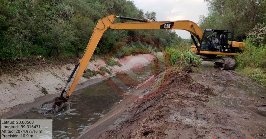 En Tula de Allende, en la zona de cruce de las colonias San Miguel Vindhó, La Amistad y Zaragoza la dependencia federal retiró el azolve del canal principal Requena con apoyo de excavadoras de brazo largo.