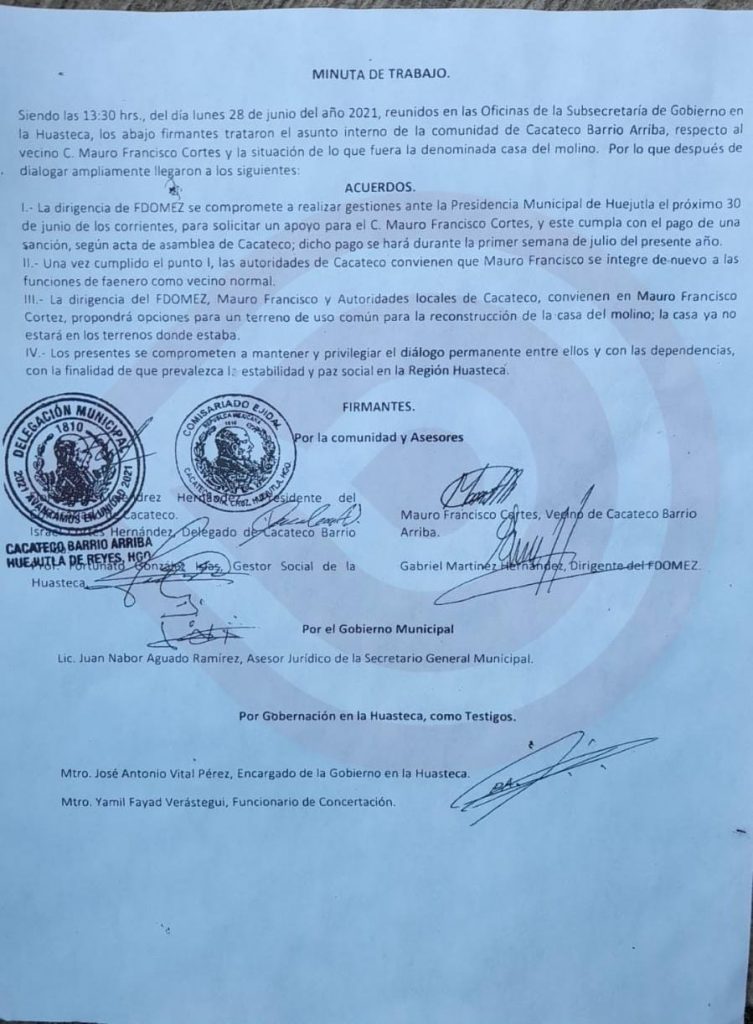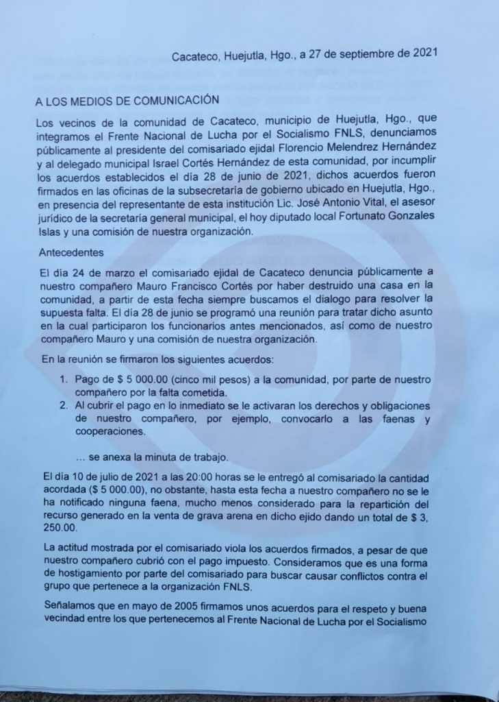 En un documento dirigido a los medios de comunicación fechado este 27 de septiembre en Cacateco, señalan “Los vecinos de la comunidad de Cacateco, municipio de Huejutla, Hgo, que integramos el Frente Nacional de Lucha por el Socialismo FNLS, denunciamos públicamente al Presidente del Comisariado Ejidal, Florencio Melendrez Hernández y al Delegado Municipal Israel Cortés Hernández, por incumplir los acuerdos establecidos el 28 de junio de 2021, dichos acuerdos fueron firmados en las oficinas de la Subsecretaría de Gobierno ubicado en Huejutla, en presencia del representante de esta institución Lic. José Antonio Vital, el Asesor Jurídico de la Secretaría General Municipal, el hoy Diputado Local, Fortunato González Islas y una comisión de nuestra organización”.