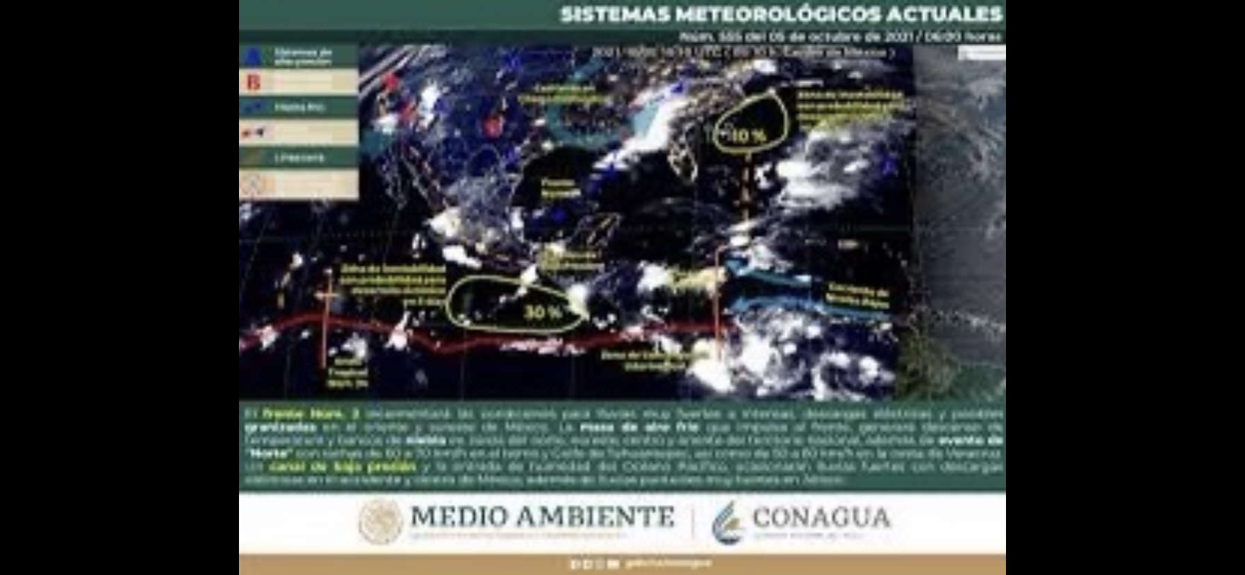 Las condiciones atmosféricas serán ocasionadas por el frente número 2, que se extenderá desde el norte hasta el suroeste del Golfo de México, su masa aire que lo impulsa, un canal de baja presión y la entrada de humedad del Océano Pacífico.