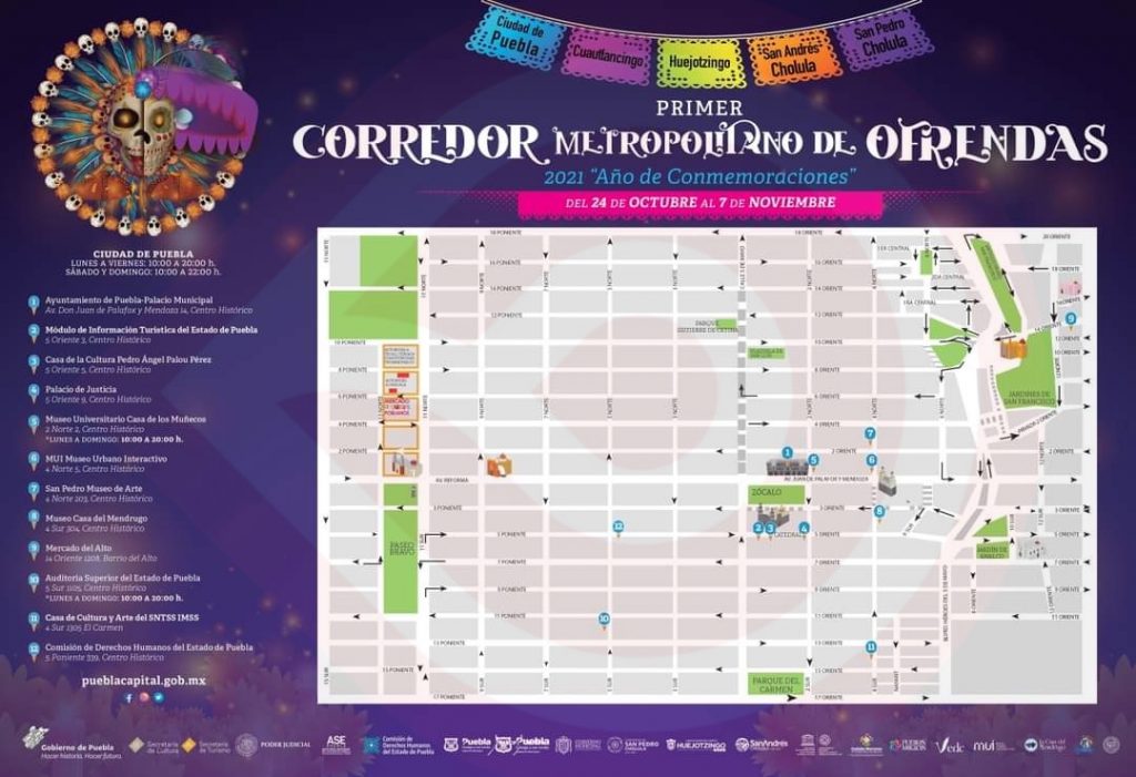 Puebla, Méx.- Por primera vez se efectúa el “Corredor de Ofrendas Metropolitano” con la participación de los municipios de Puebla, San Andrés Cholula, San Pedro Cholula, Cuautlancingo y Huejotzingo, del 24 de octubre al de 7 noviembre, organizado por del Instituto Municipal del Arte y Cultura del Ayuntamiento de la capital poblana, encabezado por el edil Eduardo Rivera Pérez.