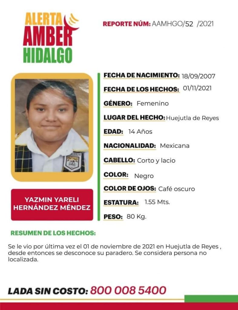 Este hecho ocurrió desde el pasado lunes 1 de noviembre, durante el transcurso de la mañana, presuntamente en la ciudad de Huejutla, cuando una menor de edad fue reportada como desaparecida a las autoridades del municipio antes mencionado, luego de haber salido de su domicilio y no haber regresado, motivo por el cual sus familiares difundieron fotografías de la niña para ser localizada.