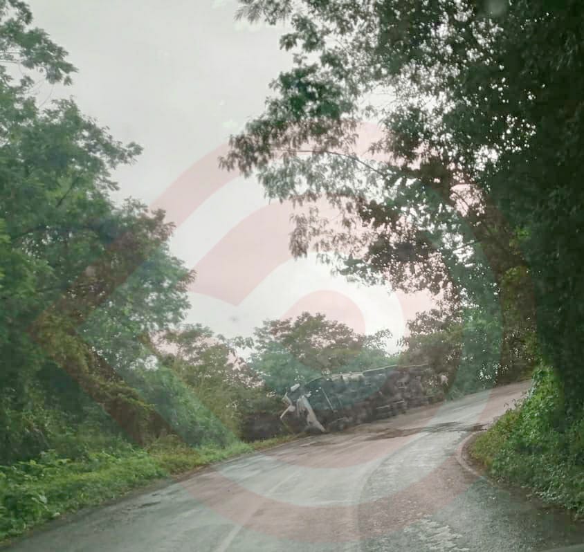 Tlanchinol, Hgo.- Elementos de seguridad pública y GN tomaron conocimiento de la volcadura de un vehículo de carga de pesada que quedó volcado a un costado de la carretera.