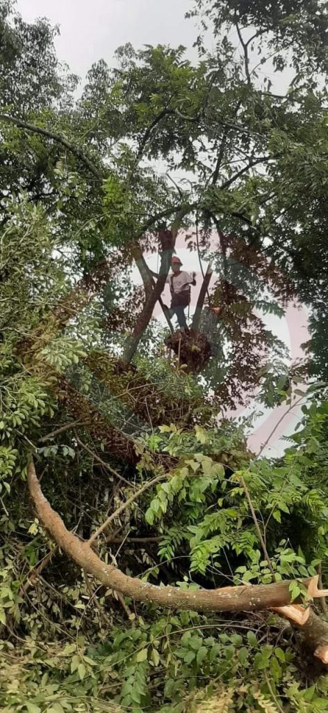 Huejutla, Hgo. – A petición de la delegación municipal de la colonia Parque de Poblamiento Solidaridad de esta ciudad, personal de Protección Civil (PC) realiza el desrame de árboles en esta zona poblacional.