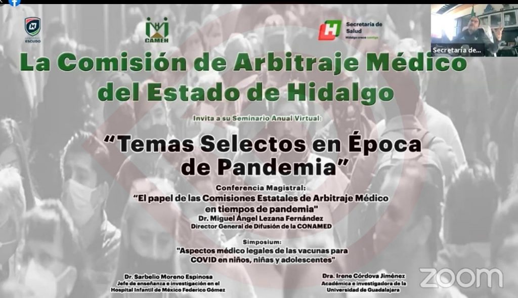 Pachuca de Soto, Hgo. – De manera virtual, y como cada año, la Comisión de Arbitraje Médico del Estado de Hidalgo (CAMEH), llevó a cabo el seminario denominado, “Temas selectos en época de pandemia”.