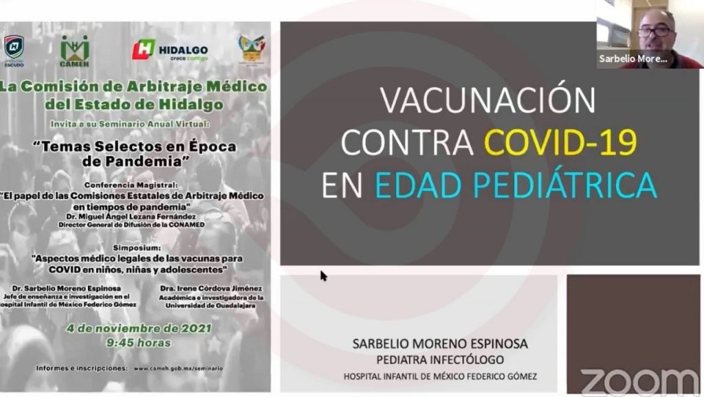 Para el desarrollo de la plática virtual, se contó con la participación del Doctor Sarbelio Moreno Espinosa, Jefe de enseñanza e investigación en el Hospital Infantil de México “Federico Gómez”; la Dra. Irene Córdova Jiménez, catedrática e investigadora de la Universidad de Guadalajara y el Dr. Miguel Ángel Lezana Fernández, Director General de Difusión e Investigación de la Comisión Nacional de Arbitraje Médico. Los ponentes, abordaron temas relativos a “Aspectos médicos de las vacunas vs COVID para niños, niñas y adolescentes, ¿qué sabemos?”, “Vacunar a las niñas, niños y adolescentes contra COVID-19. Consideraciones desde la Bioética” y “El papel de las Comisiones Estatales de Arbitraje Médico en tiempos de pandemia”.