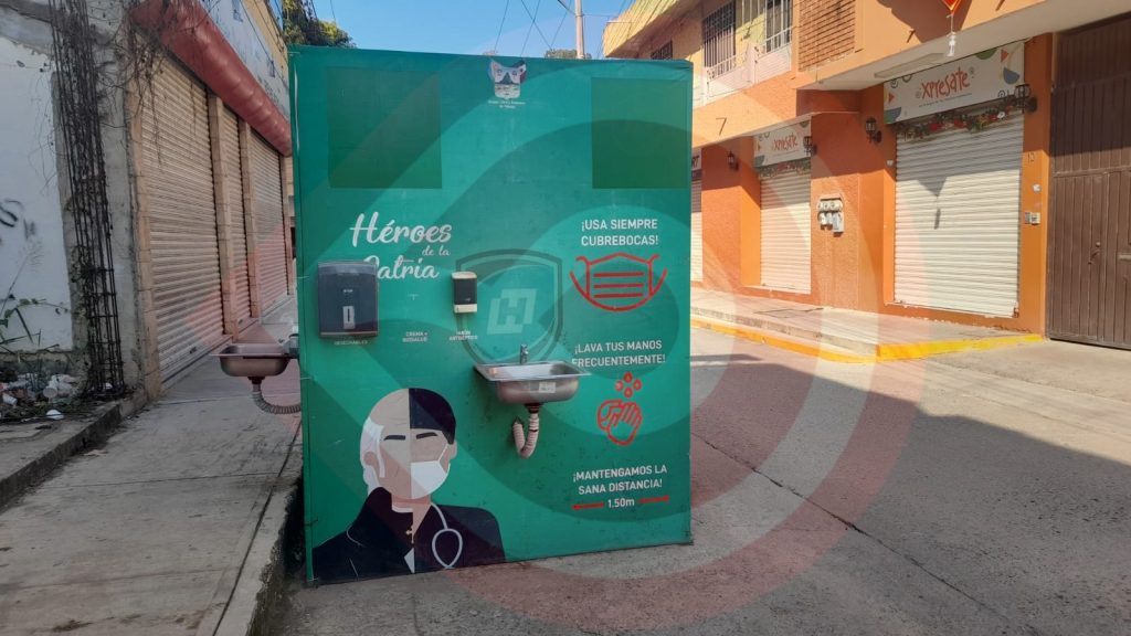 Huejutla, Hgo.- Por estar ya prácticamente sin servicio, los lavamanos de la cabina sanitizante instalada en la calle Zacatecas, de la Zona Centro, desde el inicio de la pandemia del COVID-19, se están utilizando como depósitos para basura.
