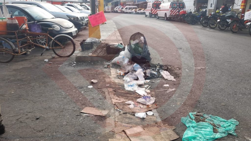 Refirieron que los carteles provisionales de “no tirar basura”, colocados por la dirigencia de la Unión de Comerciantes Locatarios y Ambulantes (UCLA), tienen buena intensión, pero prácticamente son “letra muerta”, ya que nadie los respeta, pero el colmo es que en esta ocasión el reguero de basura se encuentra en la salida del estacionamiento del mercado, un lugar muy concurrido peatonal y vehicularmente.