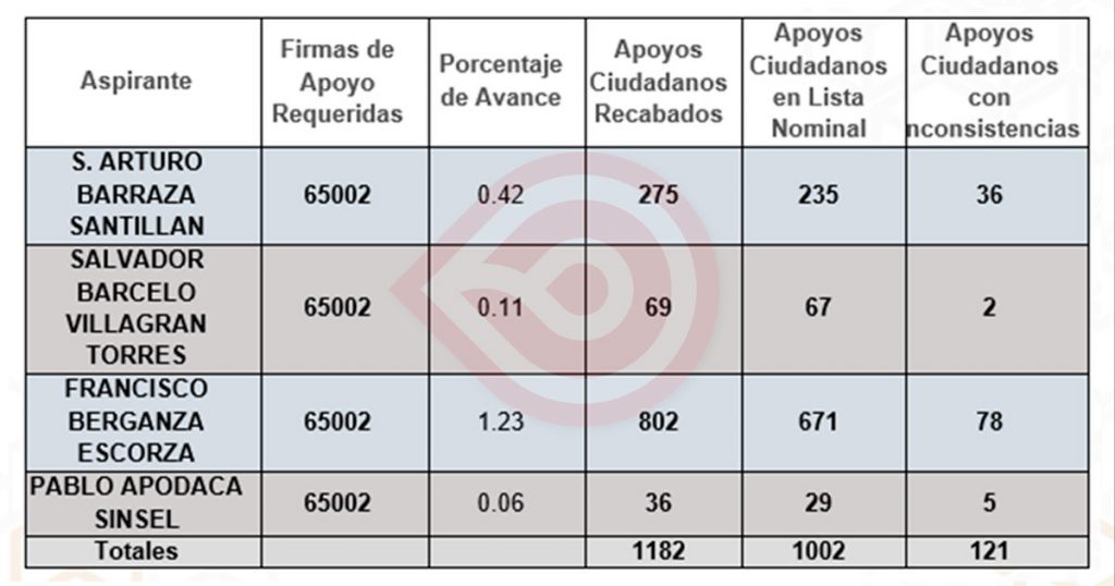 Destacó que una vez concluida la etapa de la Manifestación de Intención, se recibieron un total de 8 solicitudes y el Consejo General resolvió aprobar 4 de éstas a favor de los ciudadanos S. Arturo Barraza Santillán, Salvador Barceló Villagrán Torres, Francisco Berganza Escorza y Pablo Apodaca Sinsel, a quienes este organismo capacitó en el uso del Sistema de Captación de Apoyo y de la Aplicación Móvil para recabar el mismo con base en el Protocolo emitido para tal efecto por el Instituto Nacional Electoral (INE), informando que con corte al 06 de enero, los 4 aspirantes habían recabado las siguientes cifras: