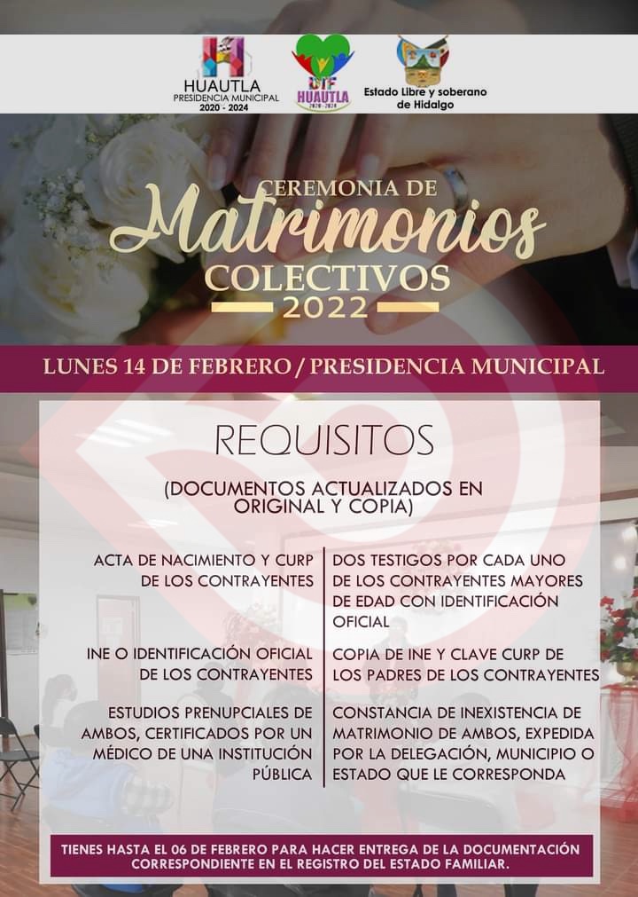 Huautla, Hgo. – El sistema DIF municipal, que preside la señora Rufina Flores Negrete, a través la oficina del Registro Civil del gobierno local, dio a conocer la fecha límite para la inscripción de parejas que deseen contraer nupcias en las bodas colectivas que tendrán lugar en el marco del Día del Amor y la Amistad.