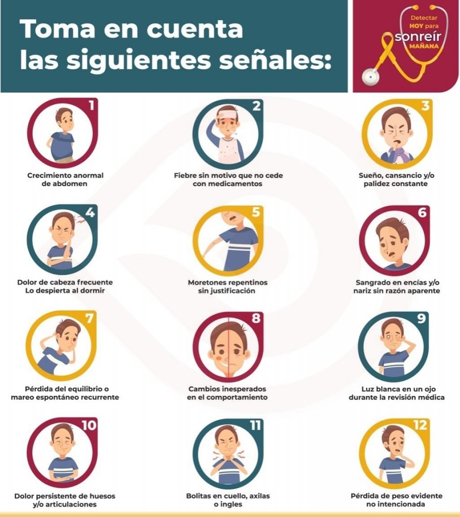 Es por ello que, estas fechas revisten mayor importancia pues sirven de espacio oportuno para difundir las molestias o cambios que pueden presentar los menores y que alertan acerca de este padecimiento como: sudoración abundante, fatiga, palidez y cansancio, dolor de cabeza, mareo, alteración de la marcha o equilibrio (caídas constantes), fiebre sin causa aparente, secreción en oído, sangrado en nariz y encías, dolor de huesos y articulaciones, puntos rojos en la piel y moretones, bolitas en el cuello, axilas e inglés y estrabismo. Ante estas situaciones, especialistas de la SSH, piden llevar al menor de inmediato a consulta para que el médico lo revise.