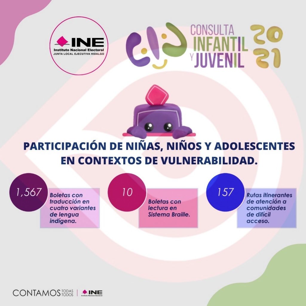 El INE Hidalgo ha hecho de esta Consulta un ejercicio incluyente garantizando la participación de niños, niñas y adolescentes en contexto de vulnerabilidad, la Vocal de Capacitación y Educación Cívica puntualizó que los datos cualitativos serán anunciados en el primer semestre del año.