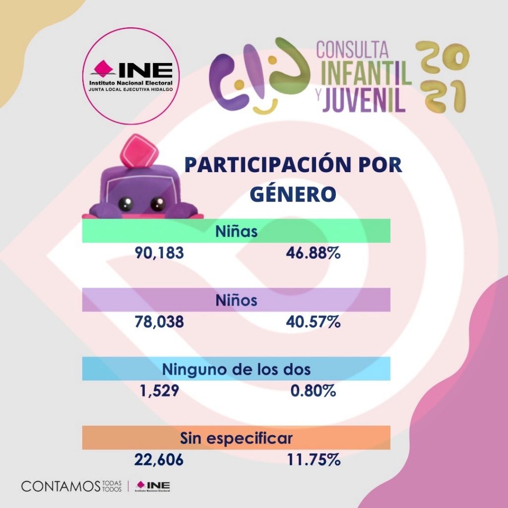 La participación en casillas físicas y virtuales fue de 112,821, mientras que las registradas en la liga genérica difundida en redes sociales fue de 79,535. Respecto a la distribución por rangos de edad se informó que de 3 a 5 años fue del 11.21%, de 6 a 9 años del 27.51%, de 10 a 13 años de 34.41% y de 17 a 17 años fue un 26.87%. Desagregado de manera consistente por género con un 46.88% de participación de niñas, un 40.57% de niños, ninguno de los dos 0.80% y quienes no especificaron su género 11.75%.