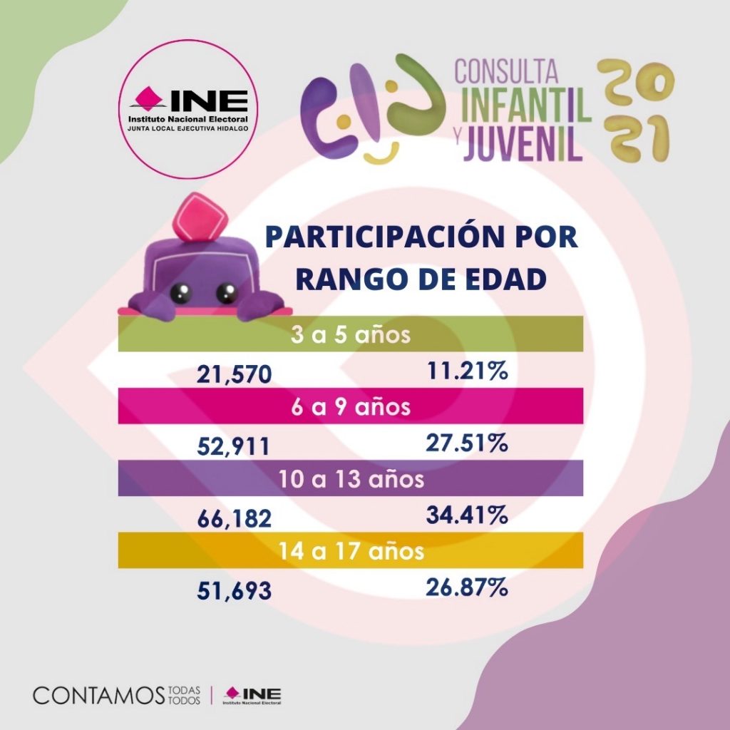 Destacando que, de 1997 a la fecha, el INE ha logrado captar la opinión de más de 27 millones de niñas, niños y adolescentes a través de diferentes ejercicios de participación infantil, es por ello que el resultado de la Consulta Infantil y Juvenil 2021, da cuenta de haber logrado el mayor nivel de participación desde hace 24 años, lo que la convierte en la más exitosa de la historia. Esta Consulta podría superar la colaboración de ejercicios anteriores, ya que, el Informe final sobre el seguimiento al Plan operativo de la CIJ 2021, arroja que 6 millones 744 mil 465 niñas, niños y adolescentes de todo el país ejercieron su derecho a la participación y a la expresión.