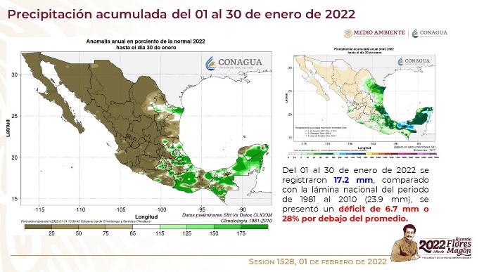 El Servicio Meteorológico Nacional (SMN) de la Conagua informó que del 1 de octubre de 2021 al 30 de enero de 2022 ha llovido 14.2 mm menos que el promedio histórico de ese mismo lapso.
