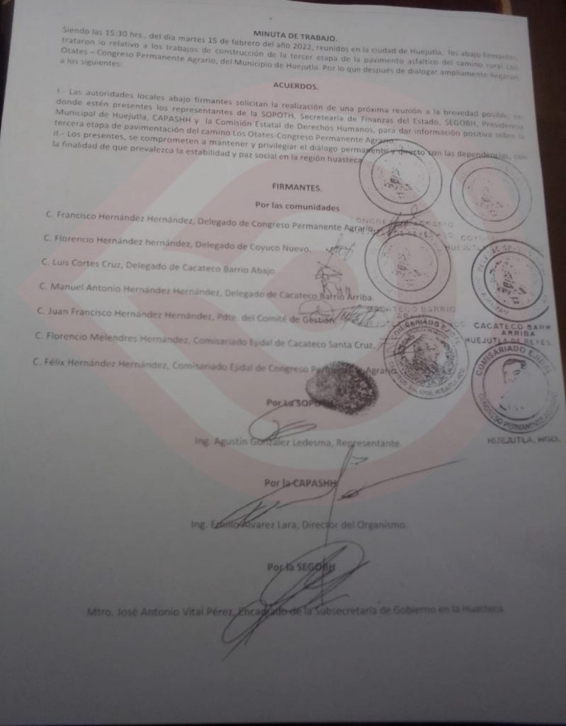 Después de casi tres horas de diálogo y en presencia de la representante de la Comisión de Derechos Humanos, Monserrat Vargas Ruiz, se firmó una minuta donde las autoridades locales solicitaron una reunión a la brevedad posible donde estén presentes las autoridades de la Secretaría de Finanzas del Estado, SOPOTH, presidencia municipal y Derechos Humanos, para dar a conocer información positiva sobre la tercera etapa de la pavimentación del camino Otates-Congreso Permanente Agrario.